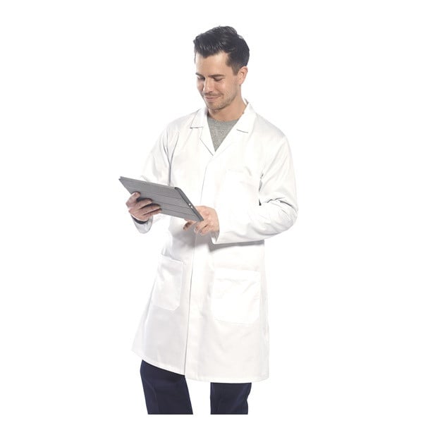 Halat Standard alb pentru productie imbracaminte de lucru din tercot rezistent cu inchidere frontala ascunsă, două buzunare inferioare și un singur buzunar la piept. Caracteristici Halat Alb Fabricat din material rezistent la uzura Partea din față ascunsă pentru acces ușor 3 buzunare mari