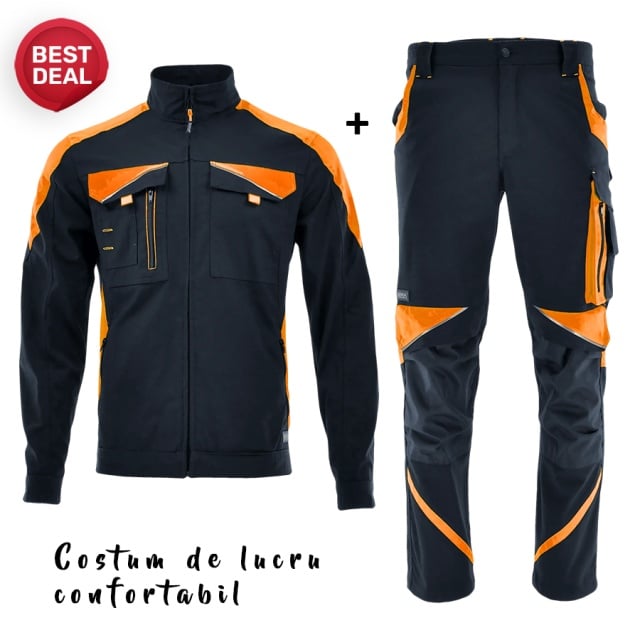 Costum de lucru confortabil: Pantalon flexibil si Jacheta rezistenta Acest costum de lucru complet îmbină siguranța, confortul și rezistența într-un set practic pentru muncă zilnică în condiții solicitante. Pachetul include: Pantaloni flexibili – confecționați din material respirabil și elastic,