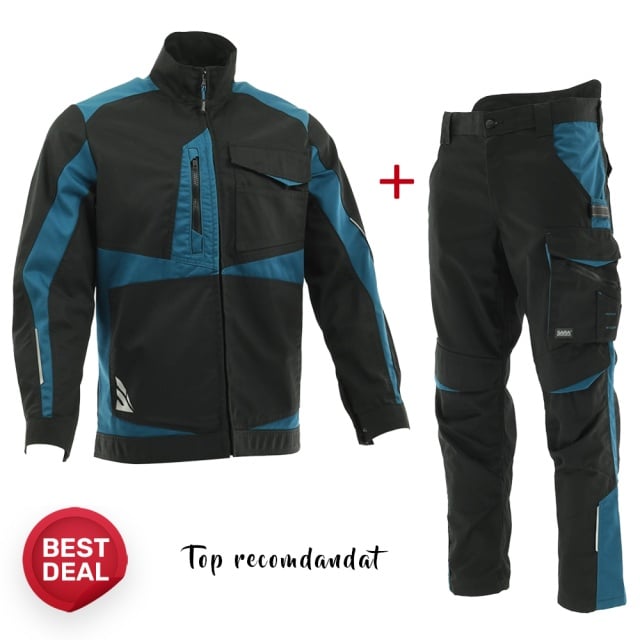 Costum salopetă confortabil și funcțional – Pantaloni talie+Jacheta, ideal pentru muncă Alege costumul salopetă confortabil și funcțional în culorile gri-albastru, compus din Jacheta si Pantaloni de lucru perfect pentru protecție și libertate de mișcare. Material rezistent, design ergonomic!