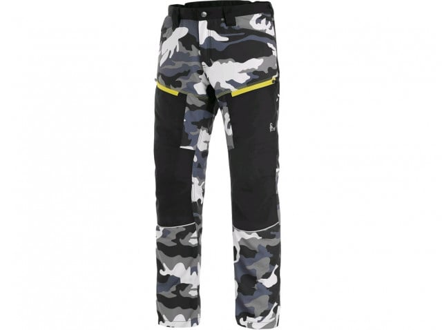 Pantaloni foarte usori camuflaj alb-gri Flexibil Pantaloni ușori pentru bărbați, materiale combinate. Talie cu benzi laterale elastice, bucle pentru curea, 4 buzunare frontale, buzunar cu fermoar în spate, ventilație pe coapse și partea din spate a genunchiului, suplimente reflectorizante, talie