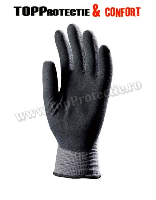 Mănuși de bază din nylon, gri • palma imersată în latex negru spumos micro • mulare lejeră pe mână, nr. fineţe 13, excelentă siguranță la prindere • manșetă elastică, cauciucată, dosul palmei cu aerisire foarte ridicată • mărime: 8, 9, 10, 11 • ambalaj: 100/10 Standard UE: EN 420, EN 388: 2132
