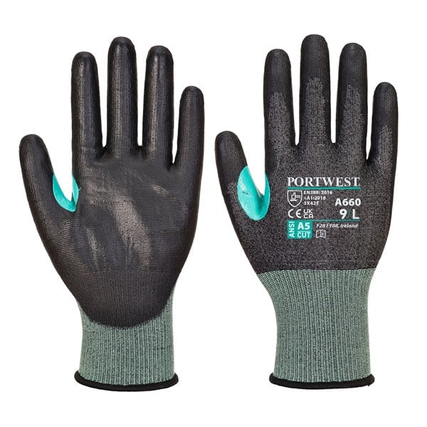 Manusi antitaiere cu palma PU pentru aderenta sigura Manusi antitaiere-cu nivel de protectie E EN ISO 21420 Dexteritate 5 EN 388:2016 3X42E ANSI/ISEA 105: 2016 Nivelul de taiere A5 Căptușeală de calibru 18 pentru dexteritate suplimentară, cu înveliș din PU, care oferă o aderență sigură în medii de