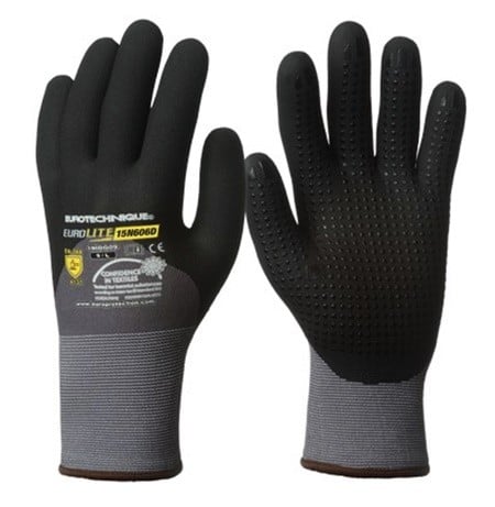 Manusi de protectie EUROLITE din seria 15N606D cu mare rezistenta la frecare si abraziune nr finete 15 respirabil 360° siguranta maxima la prindere chiar si in medii uleioase gri nylon/spandex rezistenta mare la ruptura, uzura si intepatura palma imersata in nitril negru, respirabil picouri