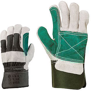 Manusi de protectie intarite palma verde 154 • palma din piele şpalt bovină, gri • întăritură din piele şpalt bovină, verde pe degetele arătător și mare, precum și pe palmă • dosul palmei și manșeta din material textil rezistent de 300 g/ m2, verde • protectori pentru artere, unghi și osul pumnului
