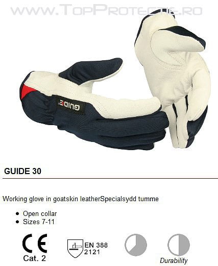 Manusi de protectie si lucru din piele capra GUIDE 30 Disponibil in marimea 8, 9, 10, 11 – manusi de lucru ce se muleaza foarte bine pe mana, confortabile – cu tesatura poliester rezistenta pe dosul maine cu buna aerisire – fabricare din piele de capra de calitate superioara in combinatie cu