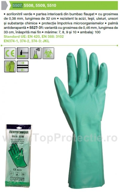 Marimea 7 si 9 Manusi protectie antichimice bumbac impregnat acrilo-nitril • acrilonitril verde • partea interioară din bumbac flauşat • cu grosimea de 0,38 mm, lungimea de 32 cm • rezistent la acizi, leşii, uleiuri, unsori și substanţe chimice • protecţie împotriva microorganismelor • palmă