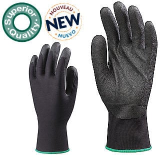 Manusi de protectie Hydropellent rezistente la contact cu apa • fir poliester 100% cu o mare rezistență la rupere, tricotată, elastică, neagră • palma imersată în PVC negru spumos, antiderapantă • suprafață Hydropellent™ rezistentă la umiditate, hidrofobă • manșetă elastică, cauciucată, dosul